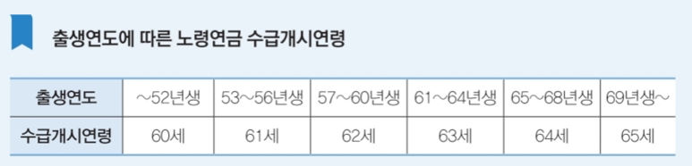 노령연금을 처음으로 수령하는 연령은 출생연도에 따라 차이가 있습니다. 과거에는 60세였는데 수급 개시 연령을 높이게 되면서 1969년 이후 출생자는 65세부터 받게 됩니다. 정확히는, 수급 개시 연령이 되는 생일의 다음 달 25일부터 노령연금을 수령합니다. (예, 1963년 2월생은? 만 63세 되는 2026년 3월 25일 첫 수령)