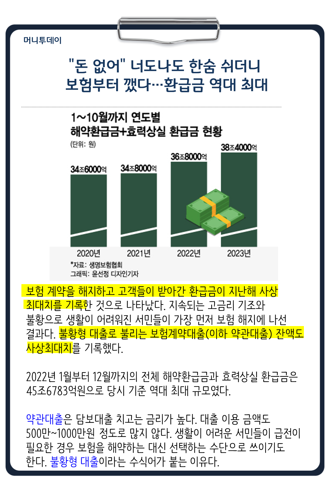 신문기사를 살펴보겠습니다. 9일 생명보험업계에 따르면 지난해 1월부터 10월까지 생명보험사들의 해약환급금과 효력상실환급금 규모는 38조4357억원으로 1년전인 2022년 같은기간 36조7608억원에 비해 4.5%증가했다고 합니다. 일각에서는 흐름상 생보업계에서만 해약환급금 및 효력상실 환급금 규모가 한해 처음으로 50조원을 넘길 수 있다는 의견도 나온다고 합니다.