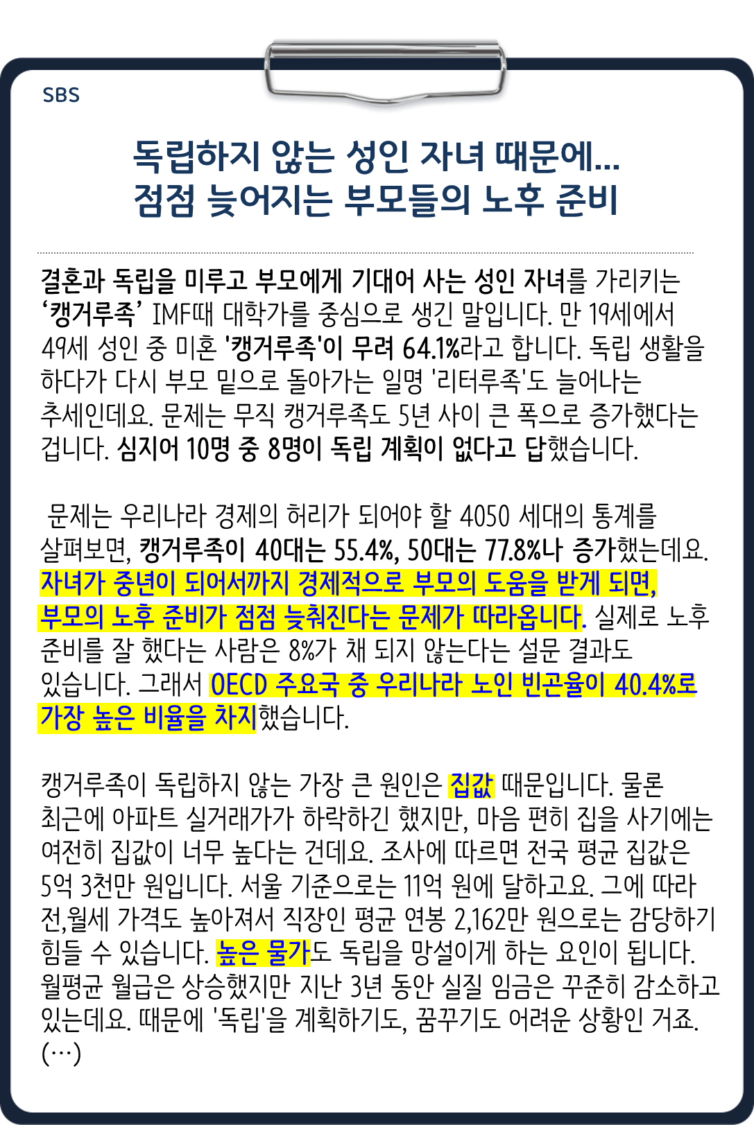 자녀를 위한 부모의 희생은 우리나라 사회에서 이해가 가지만, 정작 부모의 삶의 방식대로 살아온 젊은 세대들의 수동적인 삶의 방식과 그를 통해 되돌아온 노후 문제에 대해 생각해볼 필요가 있어 보입니다.
