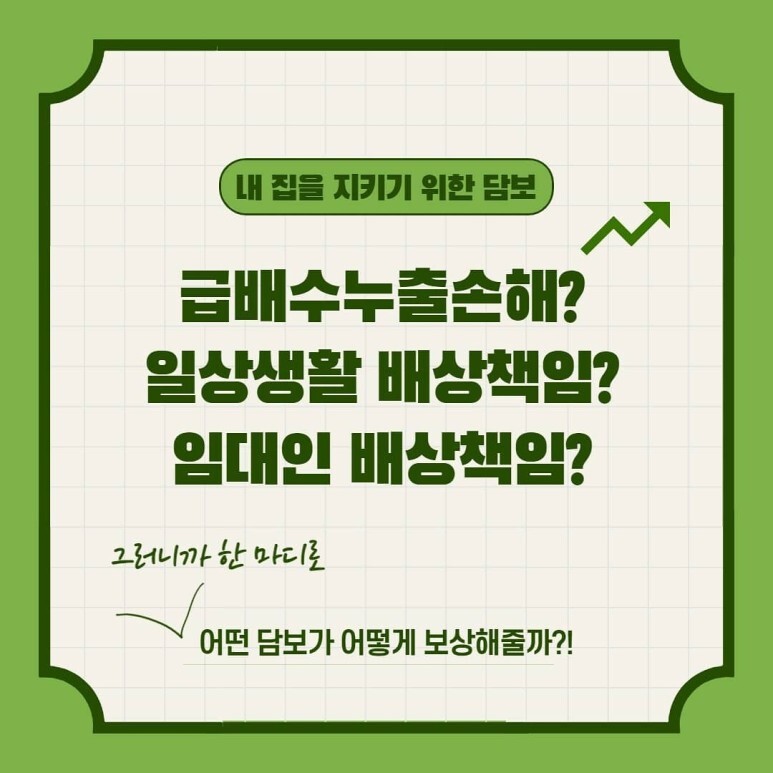 내가 남의 명의의 집에 전세를 살게되었을때 준비해야하는 담보입니다. 즉, 살고 있는 동안 나의 잘못으로 그 집에 피해를 입혔을 경우에 보장받기 위해 가입하는 것 입니다. 첫째는 누수로 인한 나의 '가재, 집기' 보상을 위한 급배수누출손해입니다. 둘째는, 꼭 누수뿐만 아니라 여러 활용도가 높은 일상생활배상책임입니다. 참고로, 세 든 집 누수는 일반적으로 집주인이 책임을 집니다. 마지막으로, 혹시 불이났을때 제대로 된 화재 보상을 받기 위한 주택화재 복구비용입니다. 이는 나중에 과실여부 따지기 때문에 미리미리 준비하는 것이 좋습니다.
