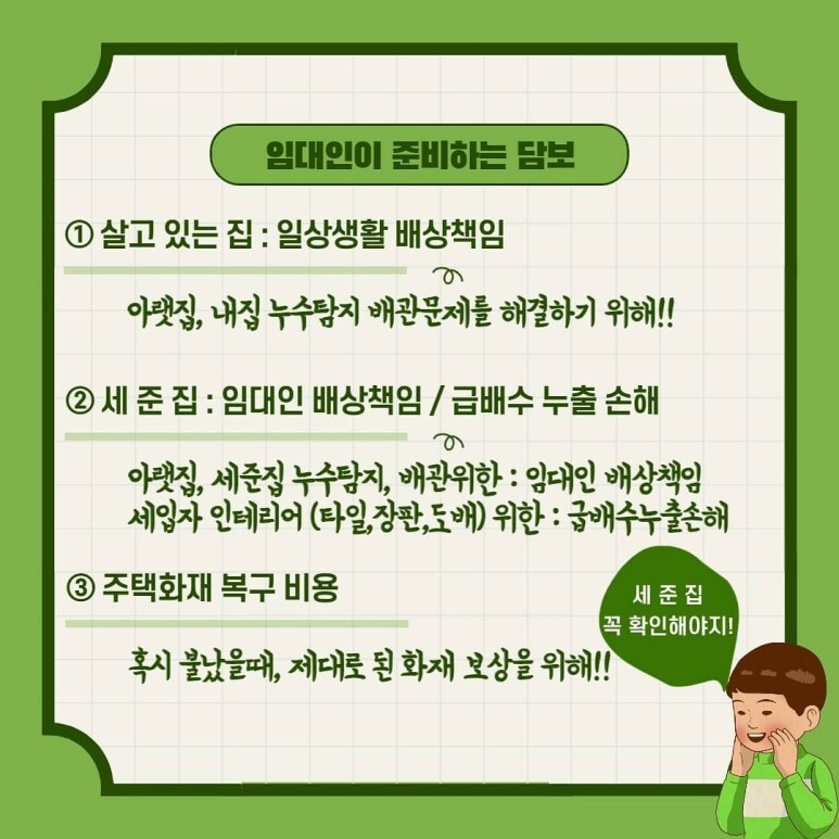 내가 남의 명의의 집에 전세를 살게되었을때 준비해야하는 담보입니다. 즉, 살고 있는 동안 나의 잘못으로 그 집에 피해를 입혔을 경우에 보장받기 위해 가입하는 것 입니다. 첫째는 누수로 인한 나의 '가재, 집기' 보상을 위한 급배수누출손해입니다. 둘째는, 꼭 누수뿐만 아니라 여러 활용도가 높은 일상생활배상책임입니다. 참고로, 세 든 집 누수는 일반적으로 집주인이 책임을 집니다. 마지막으로, 혹시 불이났을때 제대로 된 화재 보상을 받기 위한 주택화재 복구비용입니다. 이는 나중에 과실여부 따지기 때문에 미리미리 준비하는 것이 좋습니다.