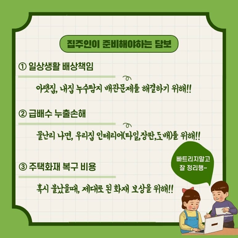 집주인이 거주하고 있을때 내 가장큰 집이라는 재산을 보호하기 위해 필요한 담보는 세가지 입니다. 첫째, 일상생활배상책임입니다. 이는, 아랫집, 내 집 누수탐지 및 배관문제를 해결하기 위해 활용됩니다. 둘째, 급배수누출손해 입니다. 이는 물 난리로 인한 우리집 인테리어 (타일,장판,도배)를 위해 사용됩니다. 마지막은, 주택화재복구비용입니다. 이는 혹시 불이났을때 제대로된 보상을 받기위해 준비하는 담보입니다.