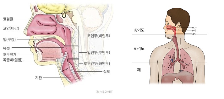 비강은 코속의 공간을 말합니다. 부비동이란 콧구멍과 연결되어 얼굴 뼈 안에있는 빈 공간을 말합니다. 위 그림에서 보듯 급성 상기도감염은 감기 비인두염을 포함해서 후두염, 부비동염, 그리도 편도염등을 모두 포함합니다. 감기는 대표적인 상기도 감염입니다.