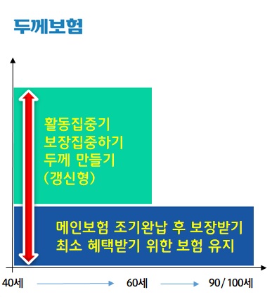 반면에, 두 번째 경우는 어떨까요? 물론 젊어서 납입 완료된 진단비 2천만 원은 치료비에 도움을 줄 것입니다. 하지만, 그렇다고 연금수입이 끊길까요? 그렇지 않습니다. 부양할 가족이 있을까요? 그렇지 않을 것입니다. 그러므로 80~100세 고비용으로 들어가는 암진단금의 보험료(비용)를 줄여서, 활동 집중기에 높은 보험금을 받도록 "두께"를 두껍게 해 놓는 것이 더 효율적인 보험가입이 아닐까요?