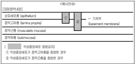 대장점막내암은 일반암일까요? 제자리암일까요? 점막은 외부와 직접 맞닿아있는 호흡기관, 소화기관, 비뇨생식기관의 내벽을 이루는 부드러운 조직입니다. 상피세포층-기저막-점막층-점막하층-근육층-장막층으로 구분되어있습니다. 대장점막내암 약관을 살펴보겠습니다. 이 계약에 있어서 대장점막내암이라 함은 대장의 상피세포층에서 발생한 악성종양세포가 기저막을 뚫고 내려가서 점막층을 침범하였으나 점막하층까지는 침범하지 않은 상태의 질병을 말합니다.