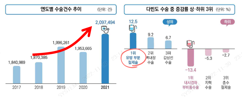 여성 발병이 99% 이상인 유방암. 대표적인 여성암으로 인한 수술이 증가했다는 부분 (특히 백내장 그렇게 이슈 됐는데 그것보다 연평균 증가량이 높다?)는 부분이 한 번쯤 생각해 보게 하였습니다.