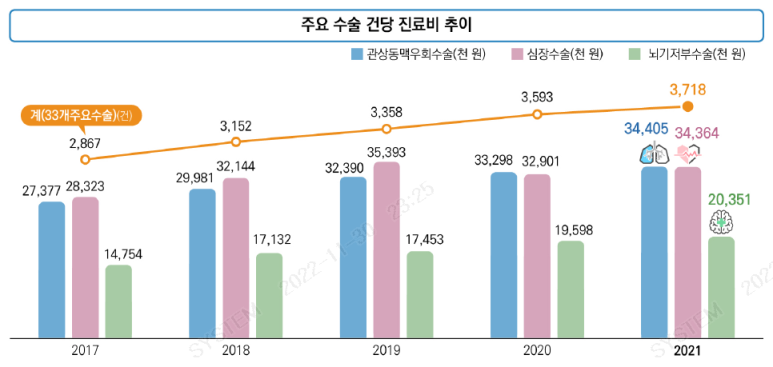 관상동맥우회술의 경우 혈관 문제가 많이 발생하는 통계까지 함께 보시면 "단순 금액이 많이 드는 수술이구나?"가 아니라, "많이 발견되고 수술도 많이 하는구나"로 연결될 수 있을 것입니다.