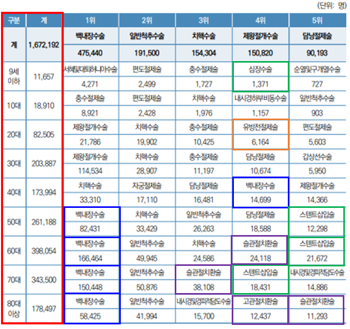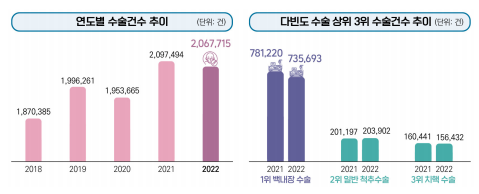 다빈도 수술 중 상위 3순위는 백내장 수술 73만 6천 건(전년대비 -5.8% 감소), 일반 척추수술 20만
