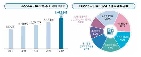 2022년 34개 주요 수술 진료비용은 8조 823억 원으로 전년대비 3.6% 증가하였습니다. 5년간 연평균으로 봤을 때도 8.2% 증가하였습니다.