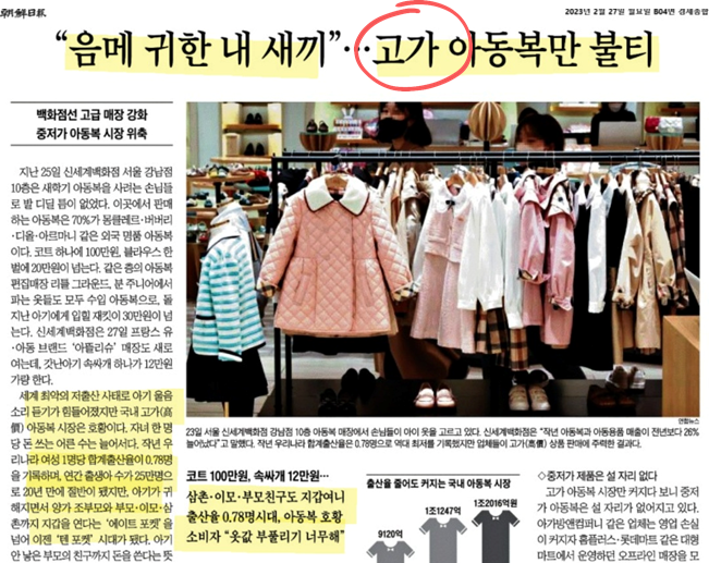 - 반면, 모든 조건을 물리치고 태어난 하나뿐인 아이에게 할아버지, 할머니, 이모, 삼촌 등등 모든 돈이 집중됩니다. 그렇게 되니 고가 아동복 매장은 호황을 이룬다고 합니다.