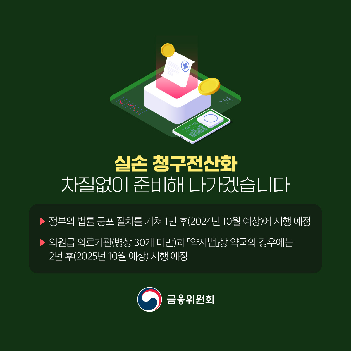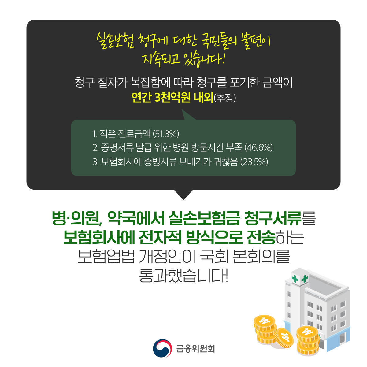 앞으로는 병원 진료 후 소비자가 요청하면 병·의원, 약국에서 실손보험금 청구서류를 보험회사에 전자적 방식으로 전송할 수 있습니다.