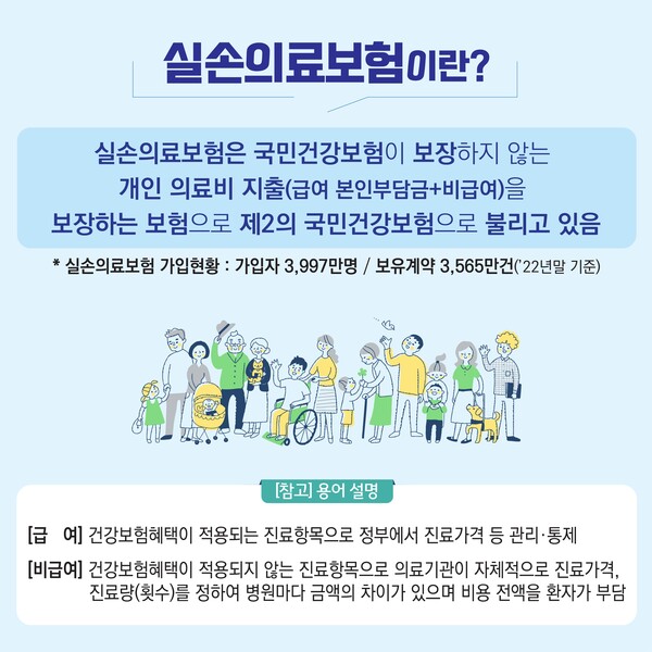 실손의료보험은 상해 또는 질병으로 실제 지출한 의료비 가운데 「국민건강보험법」 상 요양급여 또는 「의료급여법」 상 의료급여(이하 ‘급여’) 의료비 가운데 본인부담금과 같은 법에 따른 비급여 의료비 손해를 약관에서 정하는 바에 따라 보상합니다.