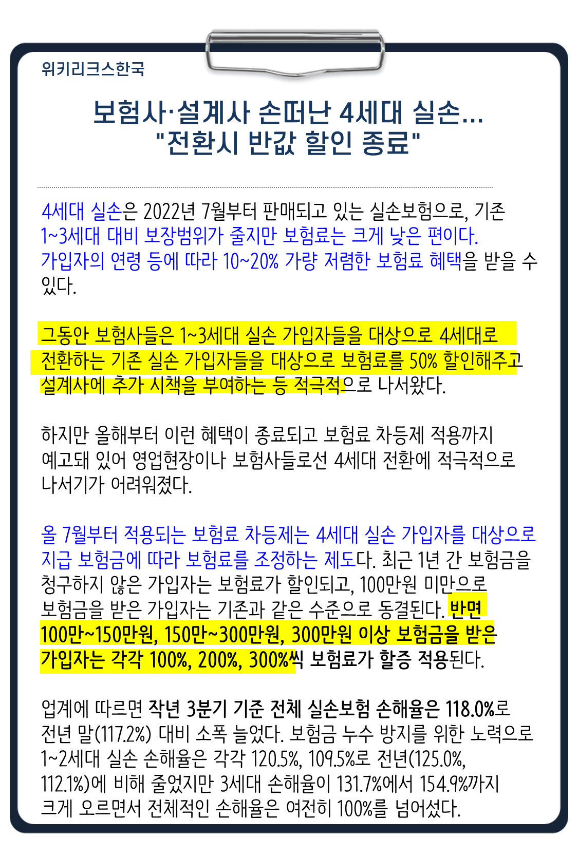 하지만 4세대 실손 전환 혜택이 사라지고 보험료 차등제 적용이 예고된 상황에서 현장 설계사들은 기존 실손 가입자들에게 전환을 권유하기가 어려워졌습니다. 4세대 실손이 기존 실손에 비해 낮은 보험료를 제외하면 보장 측면에서 나은 게 없고, 특히 1~2세대 가입자들의 경우 고령자 비중이 높은데, 병·의원 진료가 필요한 경우가 많아 4세대로 전환시 보험료가 쉽게 할증될 수 있어 전환을 유도하기도 쉽지 않은 상황입니다.