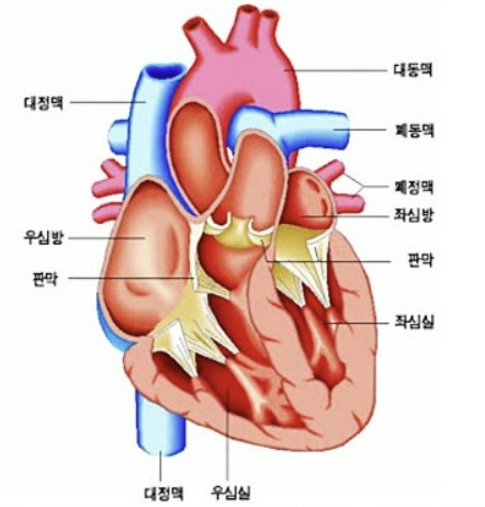 심장은 두 개의 심방과 두 개의 심실로 이루어져 있습니다. 좌심방, 좌심실, 우심방, 우심실 이렇게 네 개의 방으로 구성되어 있습니다. 방과 방 사이에, 특히 윗방과 아랫방 사이에는 판막이라는 문이 있습니다. 그래서 위에 있는 방인 심방이 쥐어짜주면 판막이라는 문이 열리면서 아래쪽 심실로 혈액이 갑니다. 그리고 이 혈액이 간 뒤에 다시 문이 닫힙니다. 결국 판막은 심실 사이에 존재하는 문이라고 보면 됩니다.