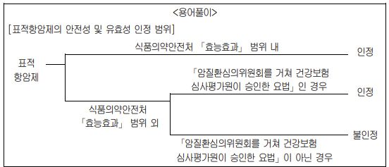 표적항암이란 표적항암제와 면역항암제 모두를 포함합니다. 암을 위해 나온 신약을 말합니다. 보험약관을 살펴보면 어떤 케이스에 사용이 가능한지 나와있습니다. 식약처에 허가를 받아야 보험회사 표적항암제에서 사용할 수 있습니다. 건강보험심사평가원에서는 급여 및 비급여 여부를 판단합니다. 식약처에서 허가를 받았다고 하더라고, 심평원에서 모두 급여처리 해주는 것 아닙니다. 즉, 대부분이 비급여 처리됩니다.