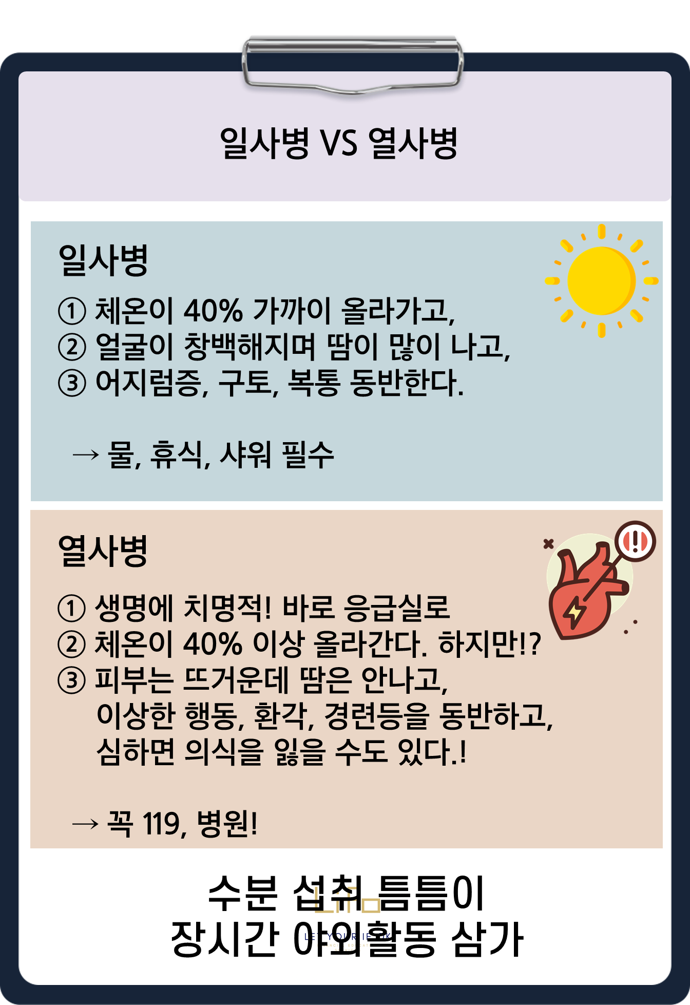열사병은 생명에 치명적일 수 있어 최대한 빨리 응급실로 가야 한다. 체온이 40도 이상으로 올라가며 피부는 뜨겁지만 땀은 안 나는 상태다. 이상행동, 환각, 경련 등을 동반하며 심하면 의식을 잃을 수도 있다.