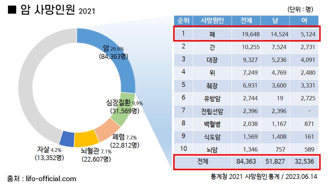 전체 암 사망률 2위가 바로 간암입니다. 발병은 전체암의 7위밖에 되지 않지만 사망은 2위인 점을 눈여겨볼 필요가 있습니다. 2021년 통계청 자료에 따르면, 남성이 51,827명 (61.4%)이고, 여성이 32,536명 (39.6%)를 차지합니다. 간암으로 인한 사망은 10,255명으로 전체 암 사망의 12.1%를 차지합니다.