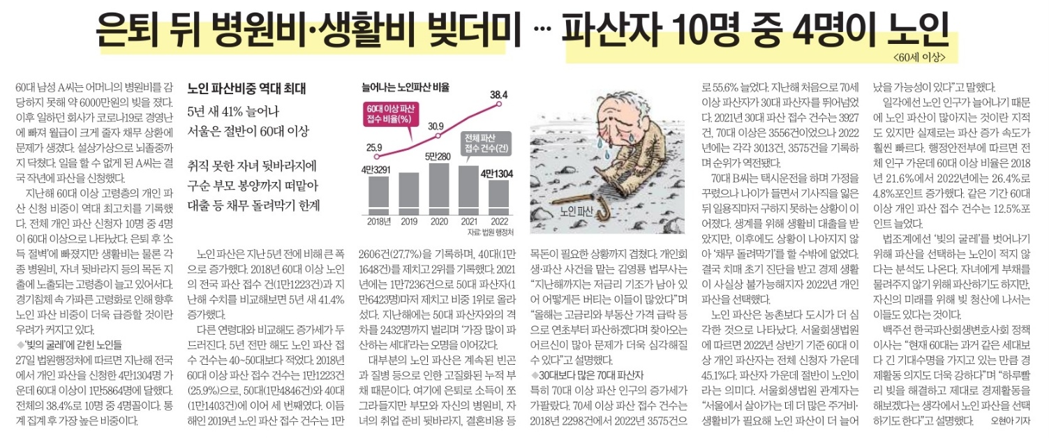 2022년 전체 개인 파산 신청자 10명 중 4명이 60대 이상으로 나타났다. 노인비중이 높은것도 특이 한데 그 이유는 두가지다. 하나는 각종 병원비, 두번째는 자녀 뒷바라지 등의 목돈 지출에 노출되서 이다. 경기침체 속 가파른 고령화로 인해 향후 노인파산 비중이 더욱 급증할 것이라는 우려가 커지고 있다.