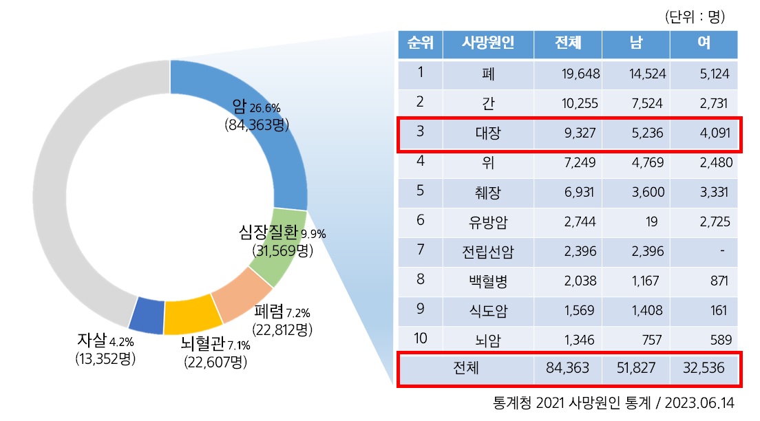 전체 암 사망률 3위가 대장암 입니다. 2021년 사망통계에 따르면, 전체 암 사망 인원은 84,363명입니다. 이중 11%인 9,327명이 바로 대장암으로 사망하였습니다. 위의 폐, 간과는 다르게 대장암은 남, 녀 사망인원이 비슷합니다. 즉, 대장암은 암 사망원인의 3위구나, 암사망인원의 10%넘는 사람들이 대장암으로 사망하는구나, 그리고 이 암은 남녀 따지지 않는구나라는 것을 알 수 있습니다.
