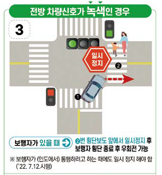 횡단보도가 녹색불인 경우 우측 횡단보도 앞에서 일시 정지 후 보행자가 횡단을 종료한 후 우회전 가능!! 단, 보행자가 인도에서 통행하려 할 때에도 일시정지 必 (`22.7.12 시행)