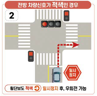 횡단보도가 빨간불인 경우 무조건 일시정지 후, 우회전 가능