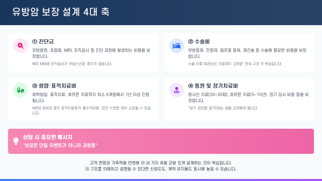 유방암 보장은 크게 네 가지 축으로 구성됩니다.