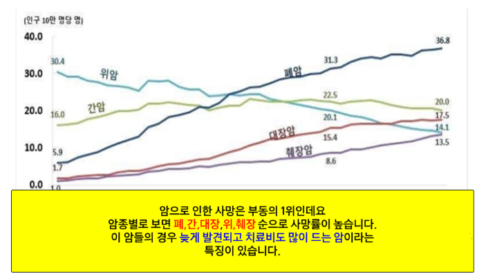 암 발병류과는 무관하게 암 사망률 1위는 남녀모두 폐암입니다. 남자는 담배등을 생각할 수 있지만 여성의 경우는 왜 그럴까요? 간접흡연, 음식조리 시 탄 냄새(조리흄)등 알게 모르게 조용히 내상을 입어가는 기관이 폐라고 합니다. 발견이 늦을뿐더러 치료비용도 많이 듭니다. 참고로 폐암 표적항암제의 대표적인 키트루다가 있습니다. 1회 투약비용이 600여만 원입니다. 세트로 15회 처방 시 9,000만 원입니다. 실비로는 한참 부족합니다.