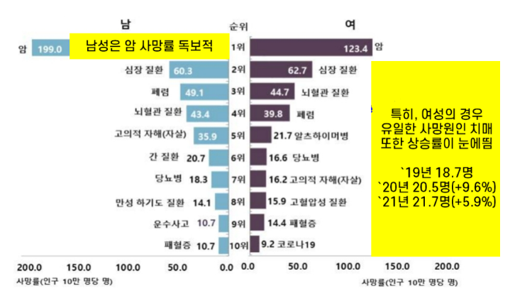 남성의 경우 인구 10만명당 199명으로 암 사망이 압도적입니다. 두 번째는 심장질환으로 10만 명당 60.3명입니다. 그 뒤를 이어 폐렴, 뇌혈관, 자살순서로 이어집니다.