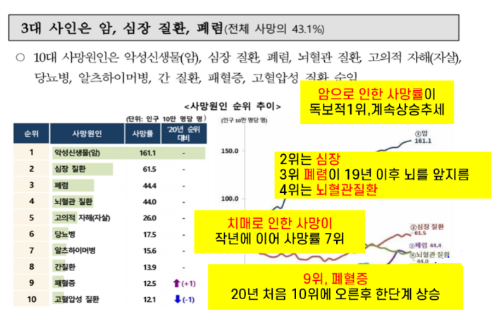 1위인 암으로 인한 사망은 매년 상승하는 추세입니다. 2위인 심장질환은 혈관질환인 협심증, 급성심근경색등과 심장자체인 심부전, 부정맥등으로 인한 사망을 합한 숫자입니다. 3위는 폐렴으로 19년 이후 뇌혈관질환으로 인한 사망을 앞질렀습니다. 4위는 뇌혈관질환입니다. 여기서 눈여겨 봐야하는 건 7위입니다. 7위는 바로 치매입니다. 치매가 직접적 사망원인으로 되었습니다. 마지막 10위는 패혈증입니다. 패혈증이란 외부 감염 시 방어 반응이 과도하고 또는 억제되어 발생하는 것으로 특히 신생아, 고령자 비중이 높습니다.