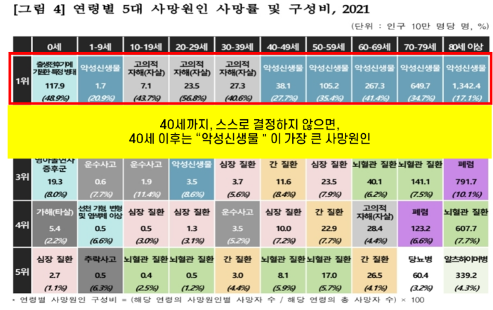 연령별 5대 사망원인 사망률 및 구성비에 따르면 10세~39세까지 고의적 자살이 1위이고, 40세이후 부터는 악성신생물이 계속 1위입니다. 즉, 40세까지 스스로 선택하지 않으면 40세 이후에 암이 가장 위험합니다.