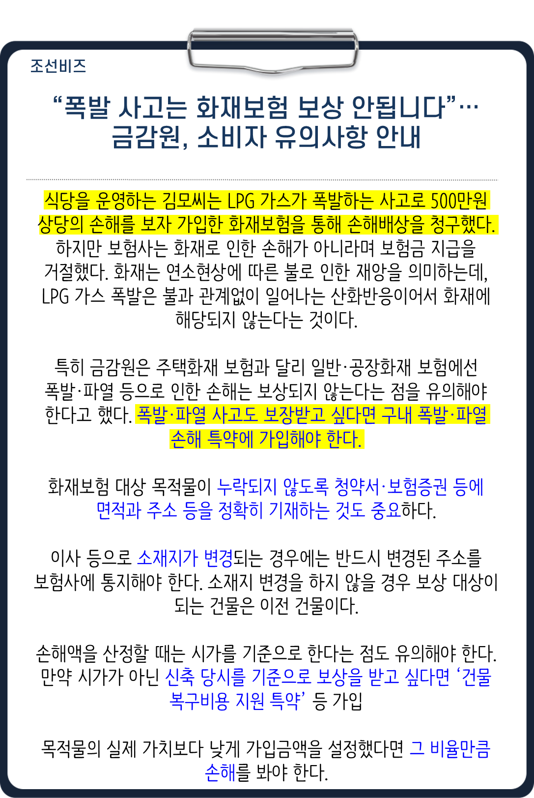 주택화재 보험과 달리 일반·공장 화재보험에서는 폭발·파열 등으로 인한 손해는 보상되지 않습니다. 보험회사는 화재담보와 폭발·파열 담보를 구분하여 ㅍ나매하고 있으며, 가입자는 보장범위를 선택하여 추가로 가입이 가능합니다. 그렇기 때문에 폭발 위험이 있는 가스 등을 취급하는 음식점 등은 『구내 폭발, 파열 손해 특약』 등을 가입하는 것이 좋습니다.